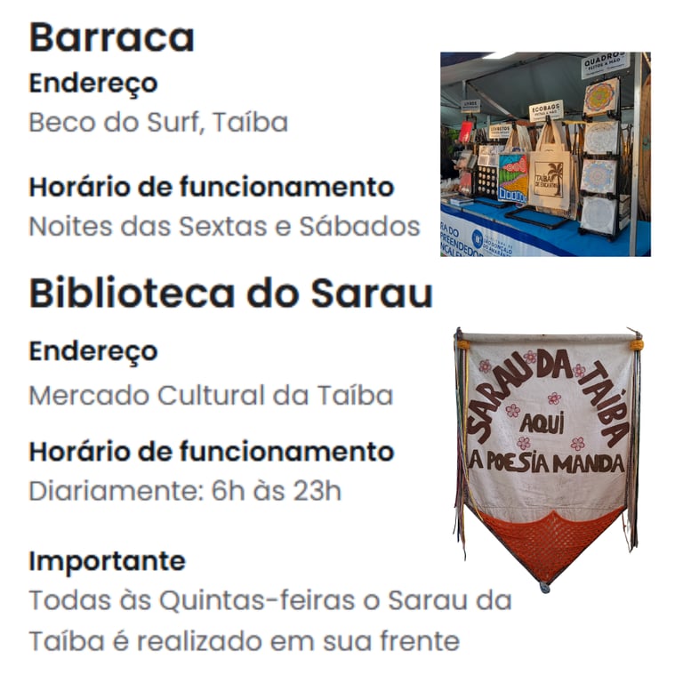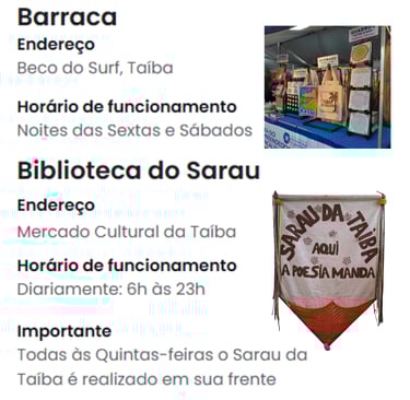 A Budega das Artes atua no Beco do Surf da Taíba com quatro linhas de trabalho: Artes da Budega, Bazar da Budega, Sebo da Budega e Publicações da Budega.
